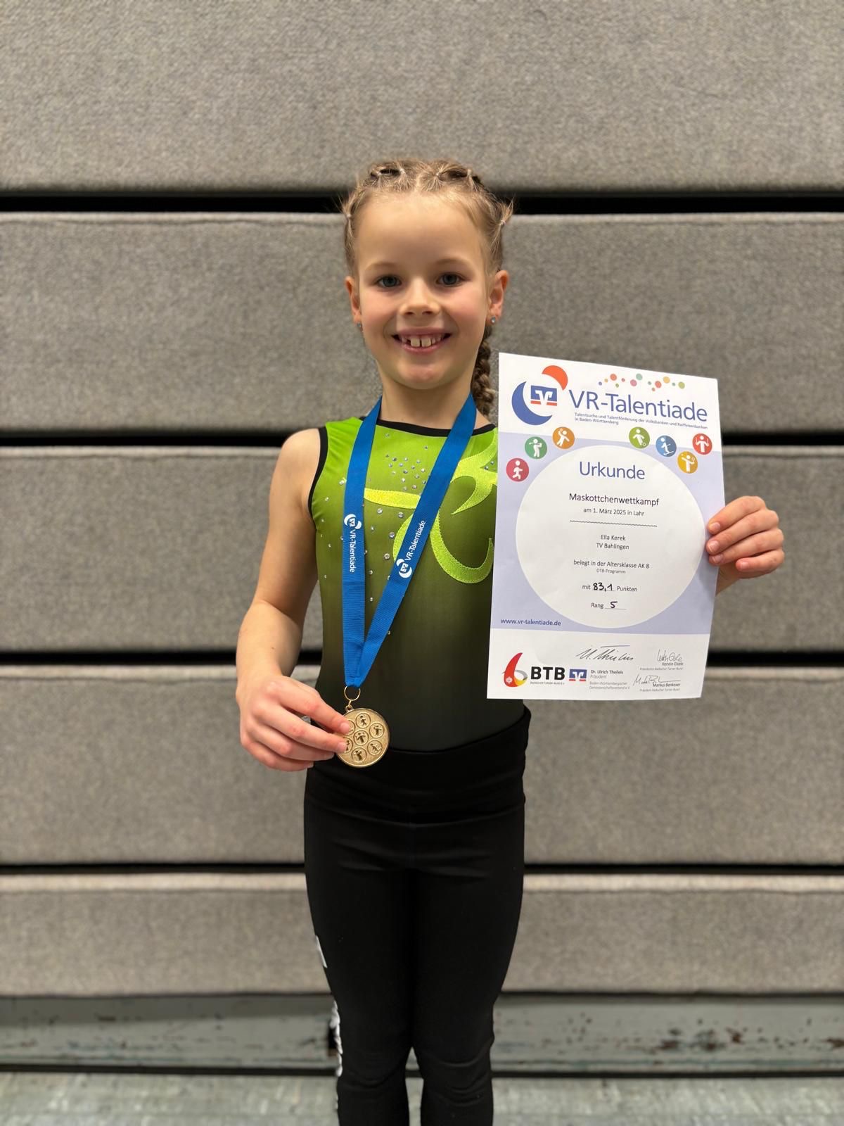 Am Wochenende starteten die beiden Mädchen ihre Wettkampfsaison mit einem Kraft-, Ausdauer- und Beweglichkeitstest. Aus ganz Südbaden waren knapp 60 Turnerinnen angereist, um sich an jeweils 10 Stationen zu messen. Getestet wurden dabei turnerische Grundpositionen, wie Handstände und Brücke; aber auch Seilspringen, Tauklettern und Sprint gehören mit zu den turnerischen Grundfertigkeiten. Ella erreichte 83,1 Punkte in der Altersklasse 8 und kam auf einen großartigen 5. Platz. In der Altersklasse 7 belegte Sophia mit 85,9 Punkten den tollen 6. Rang.